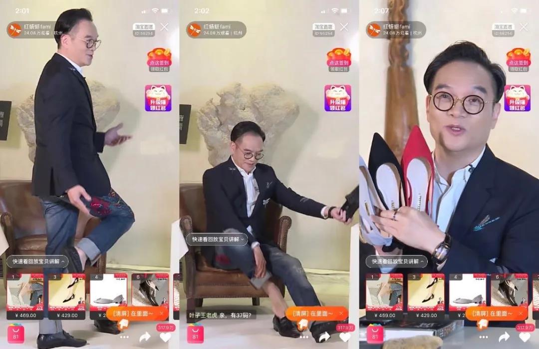 隔壁紅蜻蜓的創(chuàng)始人錢金波同樣瞄上了直播。三月八日,這位精致的董事長西裝革履,頭發(fā)梳地一絲不茍,然后對著鏡頭脫下了鞋襪,為網(wǎng)友們試穿鞋子。