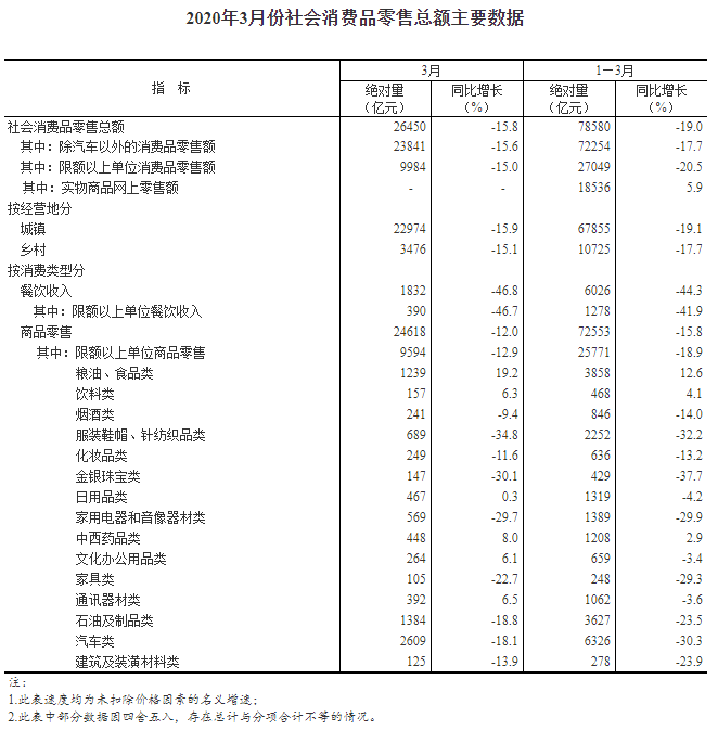 消費(fèi)方面,3月份,社會(huì)消費(fèi)品零售總額26450億元,同比下降15.8%(扣除價(jià)格因素實(shí)際下降18.1%,以下除特殊說(shuō)明外均為名義增長(zhǎng)),降幅比1-2月份收窄4.7個(gè)百分點(diǎn)。其中,除汽車(chē)以外的消費(fèi)品零售額23841億元,下降15.6%。