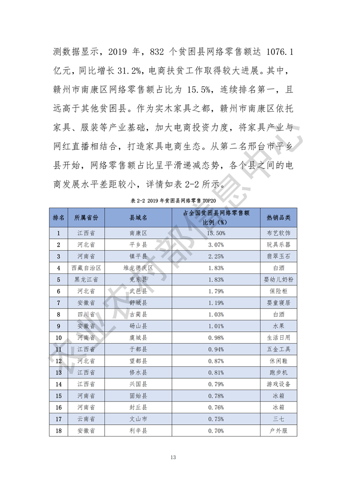 發(fā)布會指出,2019年全國2083個縣域網(wǎng)絡(luò)零售額達(dá)30961.6億元,同比增長23.5%,其中832個貧困縣網(wǎng)絡(luò)零售額達(dá)1076.1億元,同比增長31.2%;縣域農(nóng)產(chǎn)品網(wǎng)絡(luò)零售額達(dá)2693.1億元,同比增長28.5%,其中832個貧困縣農(nóng)產(chǎn)品網(wǎng)絡(luò)零售額為190.8億元,同比增長23.9%,需求側(cè)的數(shù)據(jù)、信息日益成為供給側(cè)結(jié)構(gòu)性改革的新動能,農(nóng)業(yè)的產(chǎn)業(yè)鏈、供應(yīng)鏈、創(chuàng)新鏈、價值鏈正在加速重構(gòu),電子商務(wù)成為“綠水青山就是金山銀山”的重要“轉(zhuǎn)換器”。