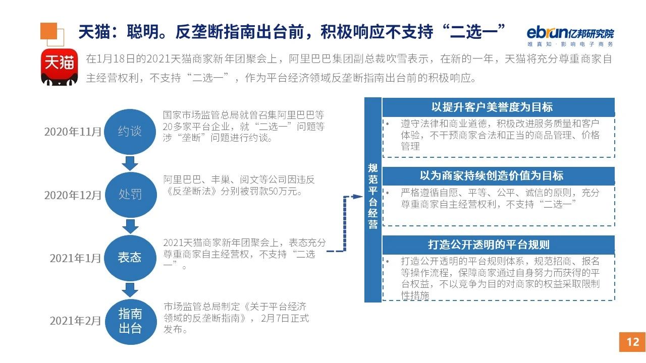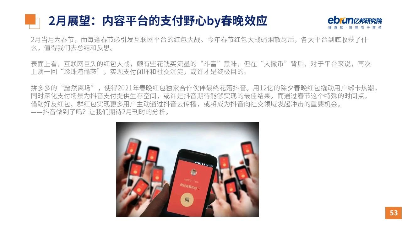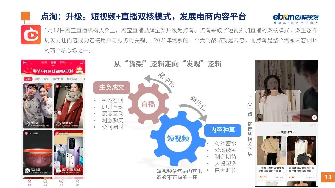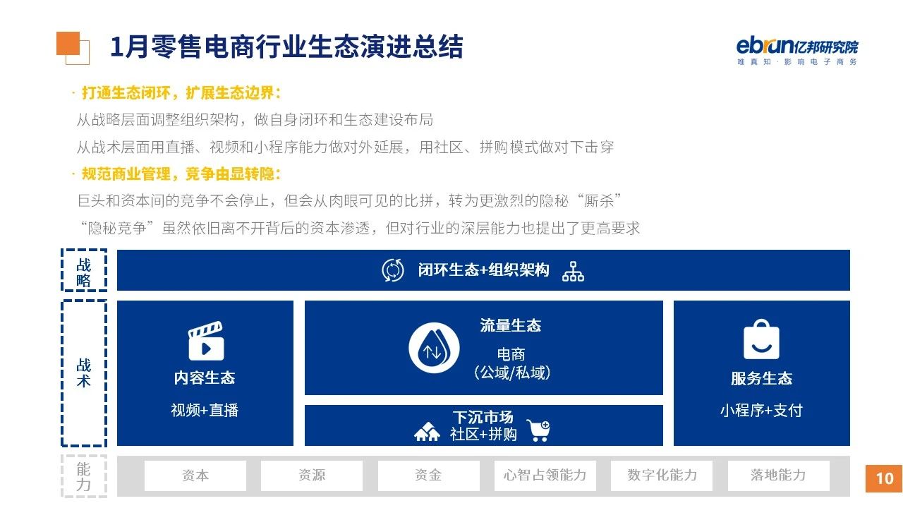 縱觀2021年1月,各平臺豐富自有生態(tài)布局,如淘寶直播(點淘)加入短視頻模式、騰訊重押視頻號、快手加碼電商和小程序、抖音推出支付等;視頻內容成為各平臺未來重點發(fā)力方向;“九不得”新規(guī)發(fā)布后社區(qū)團購仍熱情不減;國家和市場對互聯(lián)網巨頭和電商相關消費加大監(jiān)管力度……你信和不信,你知道和不知道的,都在這份億邦動力研究院正式發(fā)布的